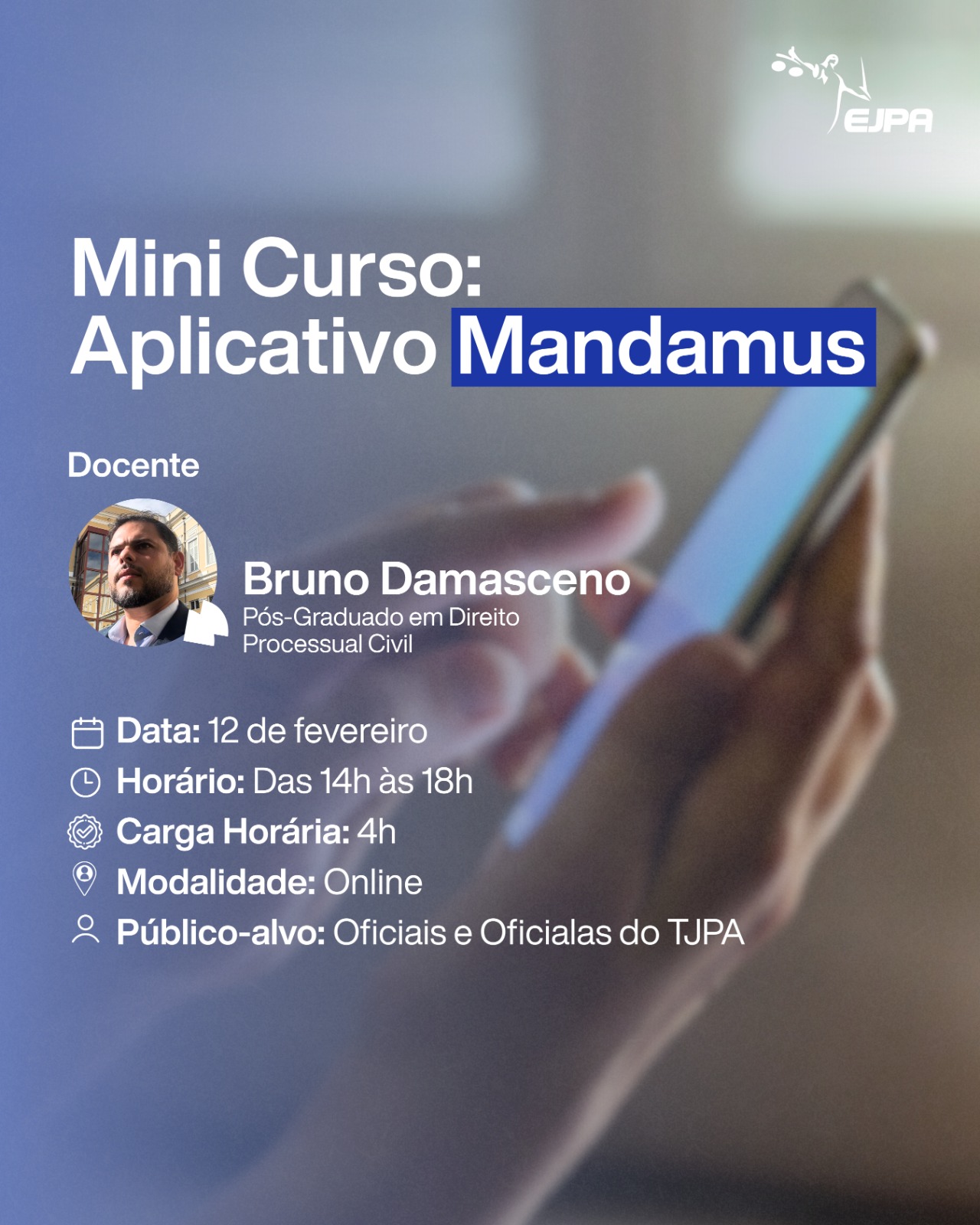 Escola Judicial abre as inscrições para o Mini Curso: Aplicativo MANDAMUS. Ferramenta que será necessária para o recebimento e devolução dos mandados judiciais. O mini curso será ministrado pelo Oficial de Justiça Bruno Damasceno.