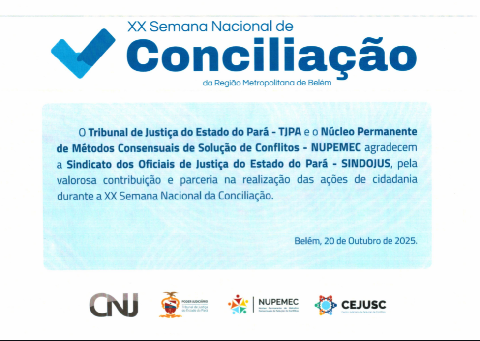 O Sindicato dos Oficiais de Justiça do Pará (Sindojus-PA) foi um dos parceiros homenageados pelo Tribunal de Justiça do Estado do Pará (TJPA) durante a abertura da 20ª Semana Nacional da Conciliação, promovida pelo Núcleo Permanente de Métodos Consensuais de Solução de Conflitos (Nupemec).